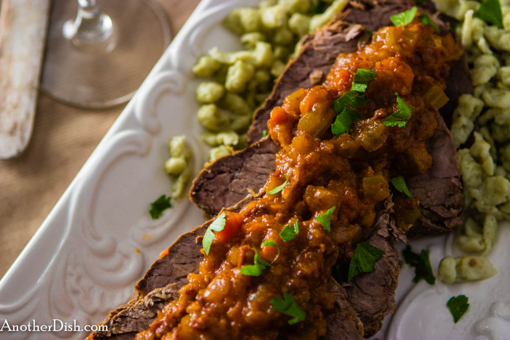 Naples_Braised_Beef1 (1 of 1)This dish seems like your typical pot roast, but it isn’t. It’s a delicious Southern Italian braise of beef, probably prepared as a Sunday afternoon dinner in Naples. The recipe called for bottom round, but I used top round instead, because I think it’s a bit more tender. Braising, the “low and slow” method of cooking, turns this relatively tough (but tasty!) cut of beef into a fork-tender, delicious roast. Although not very Italian, I like to serve it with home-made basel-herbed spaetzle.I hope you’ll try this dish!