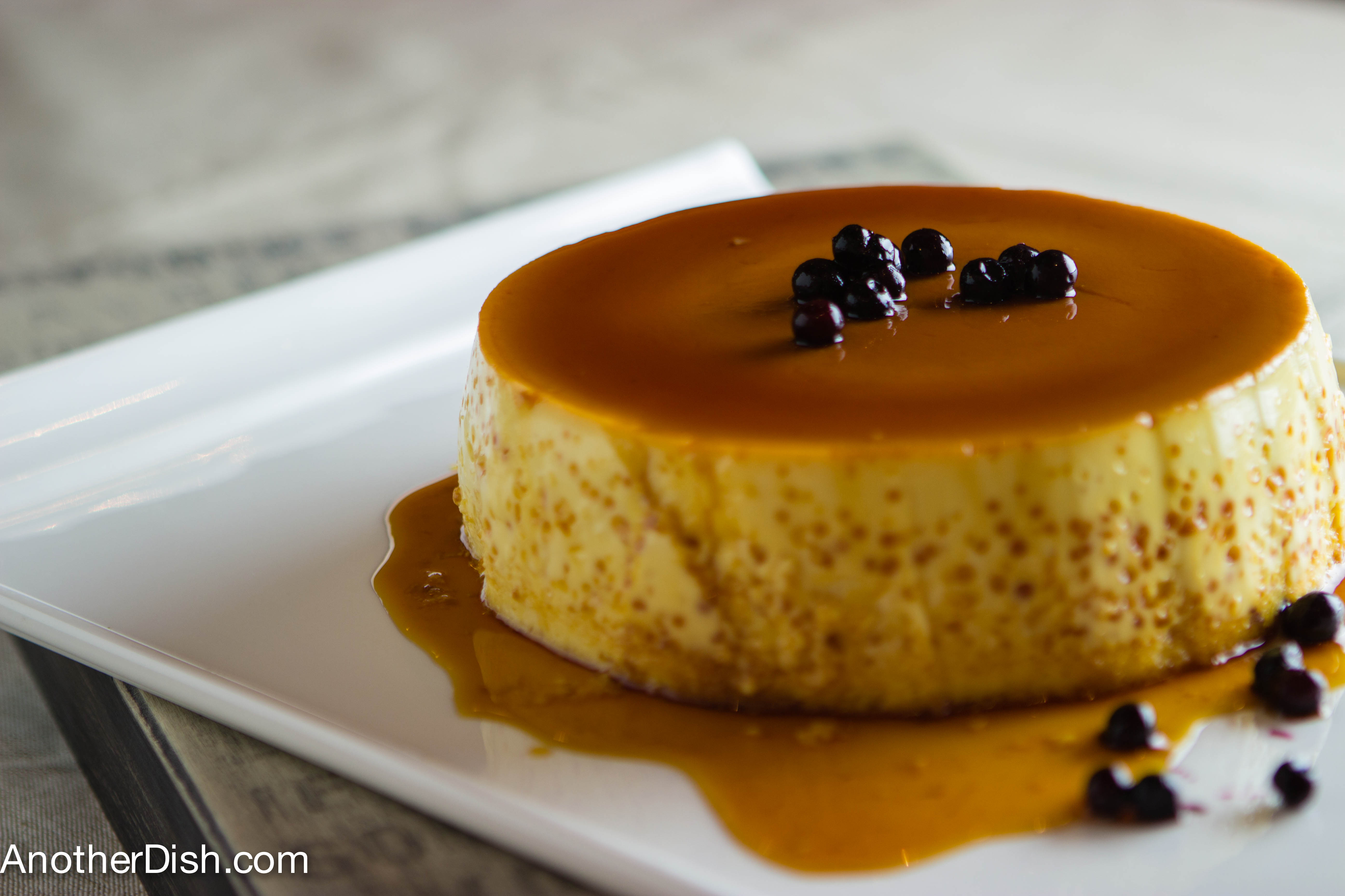 Pour custard mixture over caramelized sugar. Place dish in a pan — add water to pan so that the dish is submerged 1 inch. Place in oven and bake for 1 1/2 hours. Remove from oven and let cool completely to room temperature. Run a very sharp knife around dish to loosen flan. Invert onto a serving platter and garnish with blueberries. Serve and enjoy!