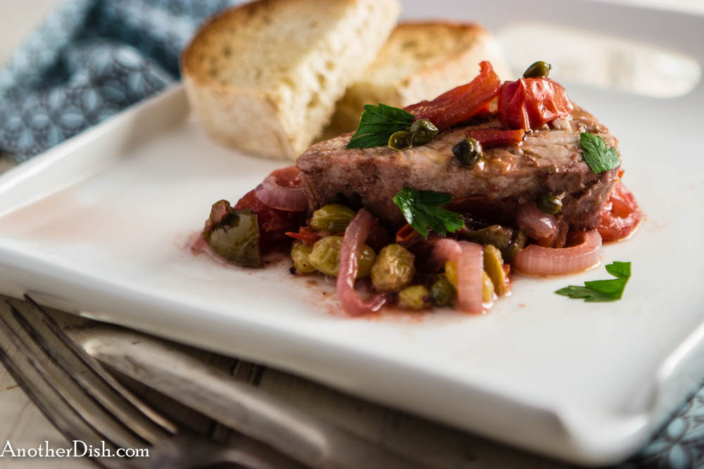 Braised_Tuna_Steaks1 (1 of 1)This is a delightful Mediterranean tuna dish. The tuna steaks are seared, then braised in a very nice red wine-caper sauce with olives, tomatoes, garlic, onions and raisins, providing for delicate, slightly sweet/slightly sour flavors. I hope you’ll try it!
