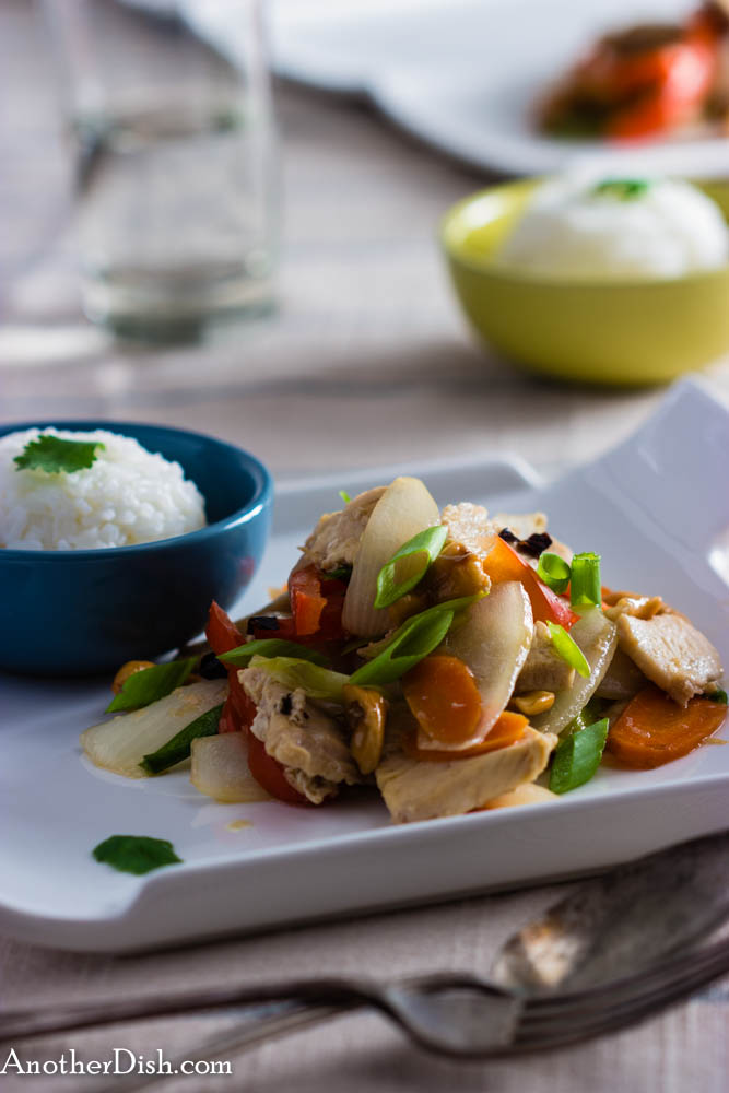 Cashew_Chicken1 (1 of 1)Here’s another stir-fry dish that’s delicious and quick to prepare. You can substitute the raw cashews with unsalted, ready-roasted cashews, but I prefer the wonderfully sweet and nutty flavors they take on when dry-roasting yourself (you can also deep-fry raw cashews in a bit of canola or peanut oil, which is what they do in Thailand). You can also substitute the dried Thai chilies with fresh ones, but I believe this dish is traditionally prepared with dried chilies. I really like this dish, and I hope you’ll try it too!